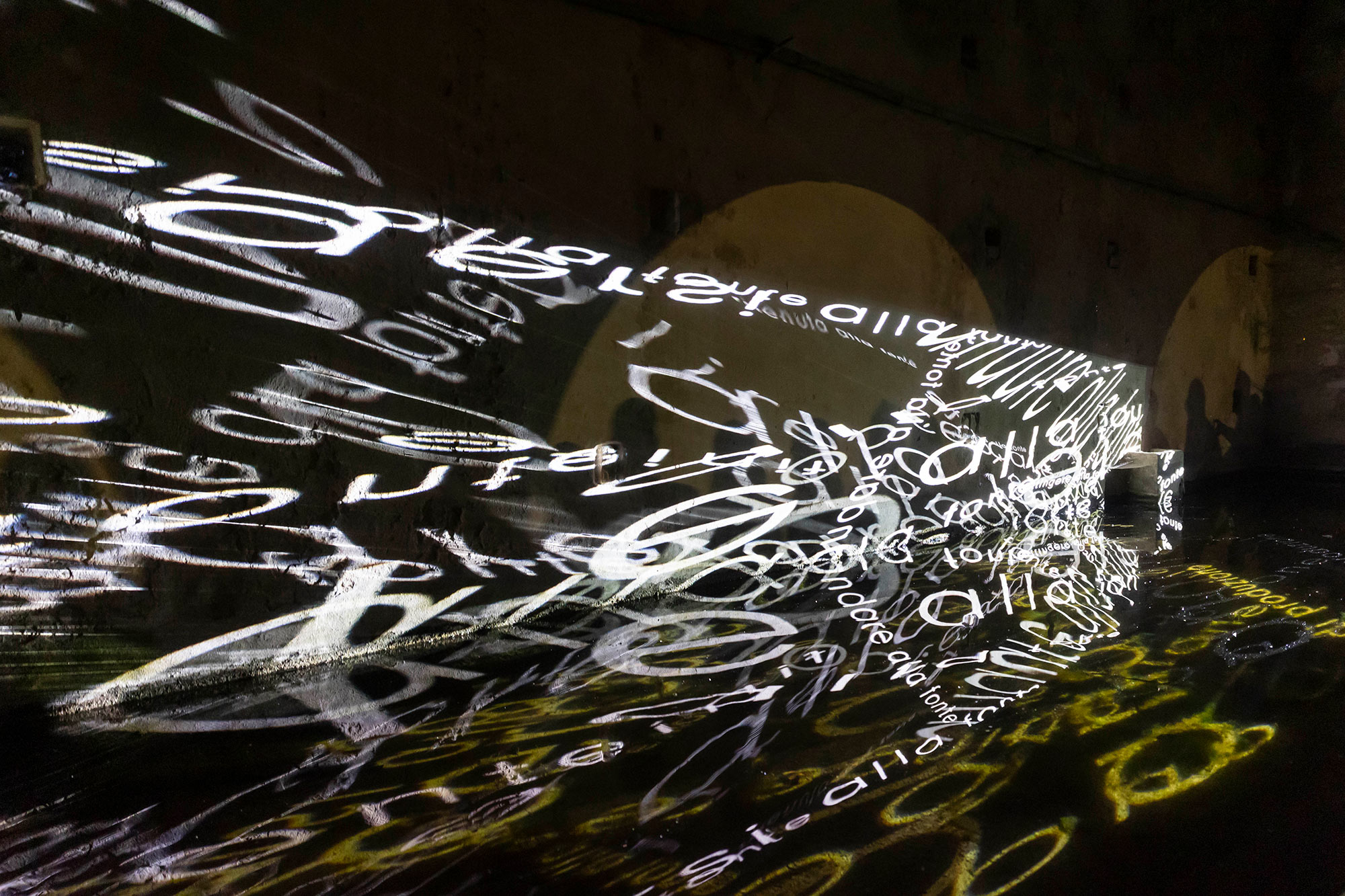 Man mano che ci si accosta, le proiezioni rivelano frasi che risuonano nell’architettura della fontana — appaiono sulla superficie dell’acqua, sul fondo della vasca, sulle pareti circostanti e in riflessi tremolanti che talvolta si dissolvono in astrazioni.